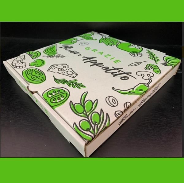 Boxes Pizza "Grazie" hinged recyclable green/white cardboard square 9"